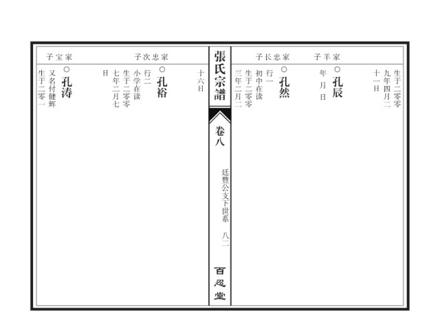 张氏宗谱 子宝家 子次忠家 子长忠家 子羊家 生于二零一 又名付健辉 日 七年二月七 生于二零零 小学在读 行二 十六日 三年二月二 生于二零零 初中在读 行一 年 十一日 九年四月二 生于二零零 孔涛 孔裕 孔然 孔辰 月 日 卷八 廷豐公支下世系 八二 百忍堂