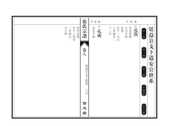 张氏宗谱 子东家 子兵家 日巳时 三年四月一 生于二零零 初中在读 实名宇成 十二日 六年四月二 生于一九九 在读 大学专科 实名帮凯 廷益公支下道安公世系 孔成 孔凯 廿一世 卷八 廿二世 廷益公支下世系 廿三世 廿四世 八五 百忍堂 廿五世