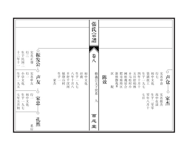 张氏宗谱 十二年十一 生于民国二 行二 实名正發 振发公 卷八 生于一九五 小学文化 行一 实名申友 生子一 镇绕山村 日舒干汊河 八年十月八 生于一九七 经商 初中文化 修義公支下世系 区 新铁静苑 肥市瑶海区 闸组现居合 乡马松村小 五日舒柏林 四年十月十 生于一九七 装潢技工 初中文化 行七 实名申倉 声友 陈效 声仓 家杰 配 七年五月初 生于一九七 初中文化 行一 七日 零年八月十 生于二零零 高中在读 实名俊杰 家忠 家杰 九 百忍堂 孔然 系后