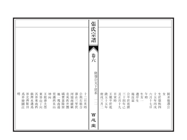 张氏宗谱 卷六 隆發公支下世系 明 爲界繪圖註 界北齊靳田 俱齊水溝爲 其界東南西 東癸山丁向 王妣葬夫塋 坤向 荒灘西艮山 地一塊南邊 礄賣業除留 北夾衖井團 河壋南破缺 葬在三里伏 公與石妣合 十二日亥時 庚戌三月二 隆五十五年 王妣卒於乾 日寅時 丑正月十九 三十四年己 公卒於乾隆 施汝霖 適庠生 生女一 午時 六月十七日 十五年丙戌 生於康熙四 女 縣丞朝選公 一二 百忍堂