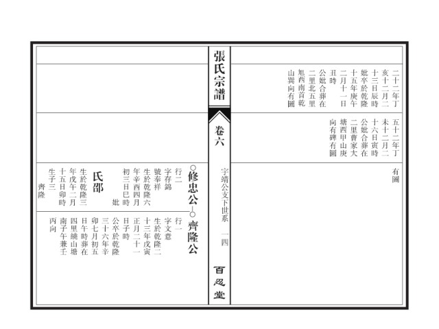 生子三 十五日卯時 年戊午二月 生於乾隆三 氏邵 初三日巳時 年辛酉四月 生於乾隆六 號奉祥 字存錦 行二 修忠公 宇靖公支下世系 有圖