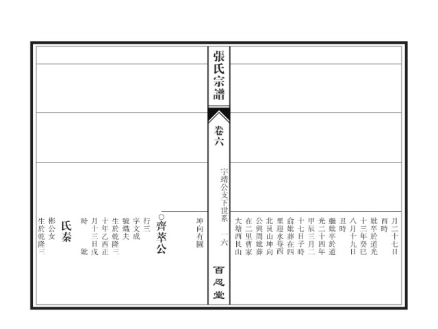张氏宗谱 卷六 宇靖公支下世系 生於乾隆三 彬公女 氏秦 時 月十三日戌 十年乙酉正 生於乾隆三 號熾夫 字文成 行三 齊萃公 坤向有圖 大塘西艮山 在二里曹家 公與周妣葬 北艮山坤向 里迎水 俞妣葬在四 十七日子時 甲辰三月二 光二十四年 繼妣卒於道 丑時 八月十九日 十三年癸巳 妣卒於道光 酉時 月二十七日 一六 妣 西 百忍堂