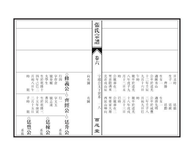 時 月初八日午 四年己巳二 生於乾隆十 太學生 號奉權 字存倉 行四 修義公 向有圖 宇靖公支下世系 北首戌山辰 里首 公妣葬在二 時 月十二日未 八年戊子九 妣卒於道光 午時 九月十六日 十二年壬辰 公卒於道光 適陳秀山 生女一 生子一 日丑時