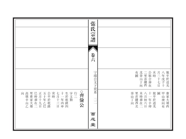 张氏宗谱 卷六 宇靖公支下世系 有圖 北癸山丁向 二里首 公妣合葬在 亥時 月二十七日 八年戊子十 妣卒於道光 西 向 高墩辛山乙 里曹家大塘 巳時葬在二 正月十九日 五十年乙巳 公卒於乾隆 寅時 七月十三日 十一年丙申 生於乾隆四 字文勤 行二 齊儉公 癸山丁向 里首 未時葬在二 八月初六日 十一年辛卯 妣卒於道光 圖 甲山庚向有 曹家大塘西 二二 西北 百忍堂