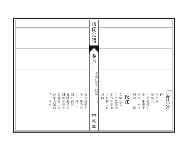 张氏宗谱 卷六 宇靖公支下世系 壬山丙向 曹家大塘西 公葬在二里 回無卒葬考 妣隨繼子領 四日酉時 十二月二十 十二年壬辰 公卒於道光 戌時 七月初二日 十六年辛丑 生於乾隆四 文輅公女 氏沈 卯時 四月十八日 十五年庚子 生於乾隆四 號思九 字文參 行三 齊昌公 二三 妣 百忍堂