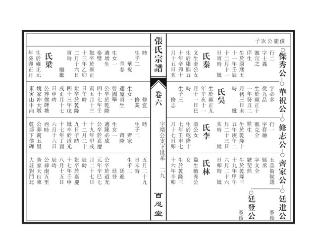 年癸卯正月 生於雍正元 氏梁 寅時 二月十六日 十三年乙卯 妣卒於雍正 秦璧 適增生 生女一 生子二 時 月十五日亥 十年辛卯十 生於康熙五 文生奎公女 氏秦 日寅時 十二月十一 十一年壬辰 生於康熙五 庠生 號宜之 字士義 行二 傑秀公