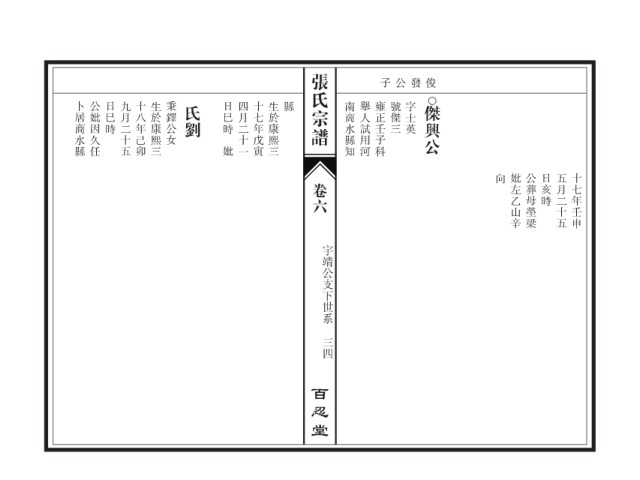 张氏宗谱 子公發俊 卜居商水縣 公妣因久任 日巳時 九月二十五 十八年己卯 生於康熙三 秉鐸公女 氏劉 日巳時 四月二十一 十七年戊寅 生於康熙三 縣 南啇水縣知 舉人試用河 雍正壬子科 號傑三 字士英 傑興公 妣 向 妣左乙山辛 公葬母塋梁 日亥時 五月二十五 十七年壬申 卷六 宇靖公支下世系 三四 百忍堂