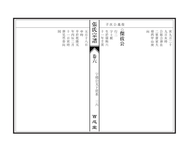 张氏宗谱 子次公義俊 同 葬兄塋旁向 十一日寅時 年丙辰二月 卒於乾隆元 申時 五月十八日 十一年壬寅 生於康熙六 字士猷 行二 傑拔公 向 塘西甲山庚 二里曹家大 公妣合葬在 九日亥時 寅九月二十 卷六 宇靖公支下世系 三六 百忍堂