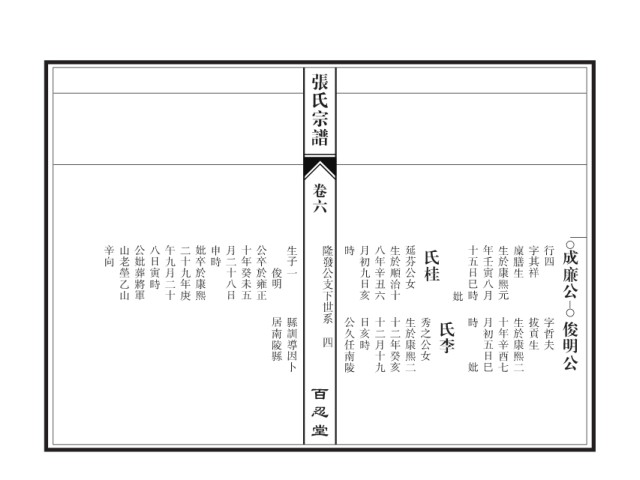 张氏宗谱 卷六 辛向 山老塋乙山 公妣葬將軍 八日寅時 午九月二十 二十九年庚 妣卒於康熙 申時 月二十八日 十年癸未五 公卒於雍正 生子一 隆發公支下世系 時 月初九日亥 八年辛丑六 生於順治十 延芬公女 氏桂 十五日巳時 年壬寅八月 生於康熙元 廩膳生 字其祥 行四 成廉公 俊明 妣 居南陵縣 縣訓導因卜 公久任南陵 日亥時 十二月十九 十二年癸亥 生於康熙二 秀之公女 氏李 時 月初五日巳 十年辛酉七 生於康熙二 拔貢生 字哲夫 俊明公 四 妣 百忍堂