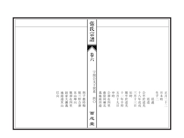 张氏宗谱 卷六 宇開公支下世系 巳向 地南邊亥山 鈕家大灘義 妣葬在四里 艮山坤向 妣三棺合葬 與子應時楊 義地南田邊 南徐岡廟北 公葬在四里 申時 五月十九日 十一年辛卯 妣卒於道光 辰時 三月十三日 十八年戊戌 公卒於道光 生子二 日未時 正月二十二 四〇 廷達 廷遴 百忍堂