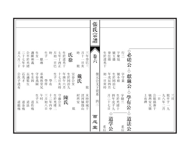 丑八月二十 二十七年辛 公卒於光緒 適陳和義 生女一 生子一 時 月初一日巳 七年丁酉正 生於道光十 氏徐 時 月十一日亥 三年癸巳三 生於道光十 登仕郎 號玉盛 字聚琨 行二 必磋公