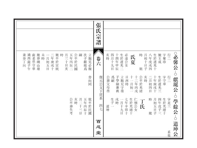 公卒葬失考 亥時 月二十三日 五年丙辰十 妣卒於民國 生子一 戌時 一月十九日 七年辛卯十 生於光緒十 仁懐公女 丁氏 時 月初五日子 四年戊子三 生於光緒十 字足三 學餘公