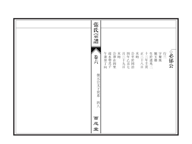 张氏宗谱 午兼癸丁向 迎水 公葬在四里 亥時 月二十九日 四年乙丑七 公卒於同治 亥時 正二十八日 十二年壬寅 生於道光二 號玉德 字聚珠 行三 必郁公 卷六 北子 傑元公支下世系 四八 百忍堂