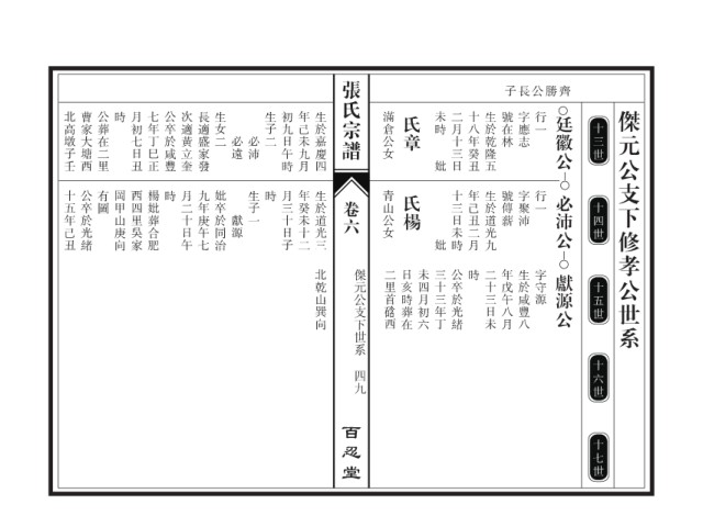 北高墩子壬 曹家大塘西 公葬在二里 時 月初七日丑 七年丁巳正 公卒於咸豐 次適黃立奎 長適盛家發 生女二 生子二 初九日午時 年己未九月 生於嘉慶四 滿倉公女 氏章 未時 二月十三日 十八年癸丑 生於乾隆五 號在林 字應志 行一 廷徽公 傑元公支下修孝公世系