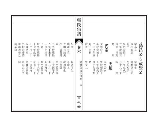 向 軍山乙山辛 公妣俱葬將 三日寅時 亥七月二十 五十八年己 妣卒於康熙 五日酉時 未三月二十 五十四年乙 公卒於康熙 桂德馨 次適監生 孔煥文 長適庠生 隆發公支下世系 生女二 時 月十九日亥 五年戊戌正 生於順治十 泰享公女 氏趙 時 月十八日未 五年戊戌三 生於順治十 貤贈登仕郎 字炳生 成賢公