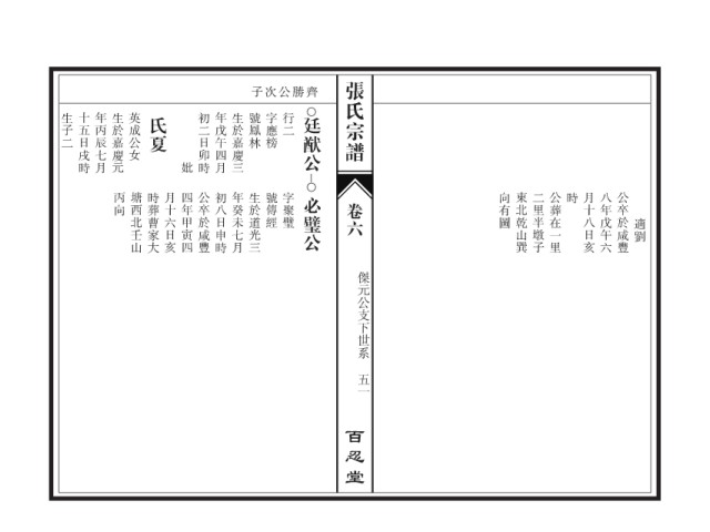 张氏宗谱 子次公勝齊 生子二 十五日戌時 年丙辰七月 生於嘉慶元 英成公女 氏夏 初二日卯時 年戊午四月 生於嘉慶三 號鳳林 字應榜 行二 廷猷公 妣 丙向 塘西北壬山 時葬曹家大 月十六日亥 四年甲寅四 公卒於咸豐 初八日申時 年癸未七月 生於道光三 號傳經 字聚璧 必璧公 向有圖 東北乾山巽 二里半墩子 公葬在一里 時 月十八日亥 八年戊午六 公卒於咸豐 卷六 適劉 傑元公支下世系 五一 百忍堂