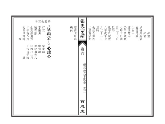 张氏宗谱 子三公勝齊 初四日寅時 年辛酉八月 生於嘉慶六 號有懋 字應勇 行三 廷勳公 庚向 塘西北甲山 二里曹家大 公妣合葬在 辰時 月二十一日 八年戊午七 妣卒於咸豐 巳時 月二十七日 七年丁巳四 公卒於咸豐 適汪慈元 生女一 應勇爲嗣 承祧與胞弟 必瑞 必璧 妣 十六日子時 年丙戌二月 生於道光六 號傳增 字聚瑞 必瑞公 卷六 妣 傑元公支下世系 五二 百忍堂