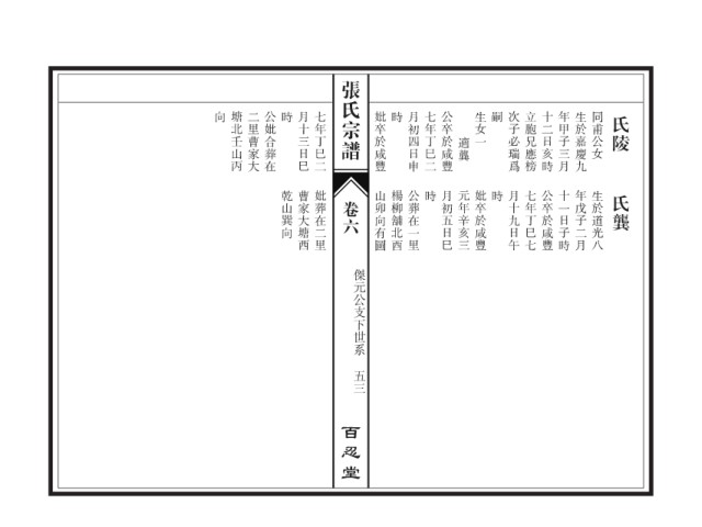 张氏宗谱 向 塘北壬山丙 二里曹家大 公妣合葬在 時 月十三日巳 七年丁巳二 妣卒於咸豐 時 月初四日申 七年丁巳二 公卒於咸豐 生女一 嗣 次子必瑞爲 立胞兄應榜 十二日亥時 年甲子三月 生於嘉慶九 同甫公女 氏陵 適龔 乾山巽向 曹家大塘西 妣葬在二里 山卯向有圖 楊柳舖北酉 公葬在一里 時 月初五日巳 元年辛亥三 妣卒於咸豐 時 月十九日午 七年丁巳七 公卒於咸豐 十一日子時 年戊子二月 生於道光八 氏龔 卷六 傑元公支下世系 五三 百忍堂
