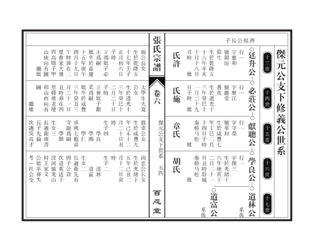 次適吳高才 長子先倫 長適衞廣書 生女三 守銀爲嗣 承祧七胞弟 生子四 時 月二十日丑 年己未十二 生於咸豐九 敦堂公女 傑元公支下世系 章氏 秦桥马松 十四日子時 年丁巳二月 生於咸豐七 號華封 字守榮 行一 獻聰公