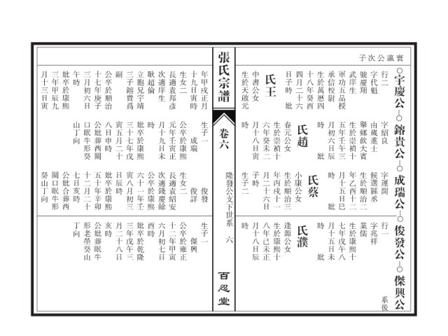 癸山丁向 關口眠牛形 公妣合葬西 七日亥時 十二月二十 五十年辛卯 妣卒於康熙 日辰時 寅八月初三 六十一年壬 公卒於康熙 次適錢慶餘 長適袁紹安 生女二 隆發公支下世系 生子二 子時 月二十六日 年丙戌十一 生於順治三 小康公女 氏蔡 時 月十五日巳 年乙酉十二 生於順治二 候選縣丞 字運開 成瑞公