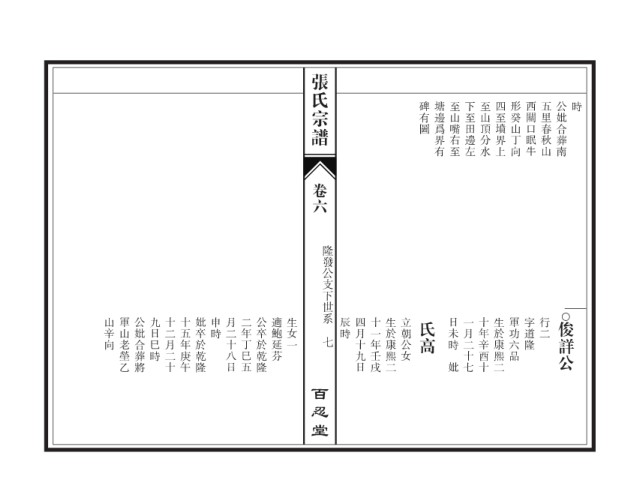 张氏宗谱 碑有圖 塘邊爲界有 至山嘴右至 下至田邊左 至山頂分水 四至墳界上 形癸山丁向 西關口眠牛 五里春秋山 公妣合葬南 時 卷六 隆發公支下世系 山辛向 軍山老塋乙 公妣合葬將 九日巳時 十二月二十 十五年庚午 妣卒於乾隆 申時 月二十八日 二年丁巳五 公卒於乾隆 適鮑延芬 生女一 辰時 四月十九日 十一年壬戌 生於康熙二 立朝公女 氏高 日未時 一月二十七 十年辛酉十 生於康熙二 軍功六品 字道隆 行二 俊詳公 七 妣 百忍堂