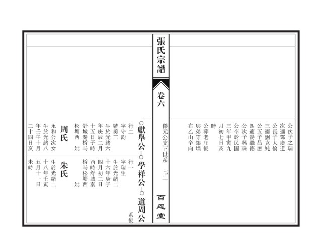 张氏宗谱 卷六 二十四日亥 年壬午十月 生於光緒八 永和公次女 周氏 松塘西 舒城秦桥马 十五日子時 年庚辰二月 生於光緒六 號勇三 字守鈞 行二 獻舉公 傑元公支下世系 右乙山辛向 與弟守銀墳 公葬老庄後 時 月初七日亥 三年甲寅九 公卒於民國 公次子興珠 四適湯繼德 公五子昌應 三適劉克純 公長子大倫 次適鄧廣道 公次子之瑞 妣 未時 五月十一日 十八年壬寅 生於光緒二 朱氏 桥马松塘西 酉時舒城秦 四月初二日 十六年庚子 生於光緒二 字瑞生 行一 學祥公 七二 妣 百忍堂 道周公 系後
