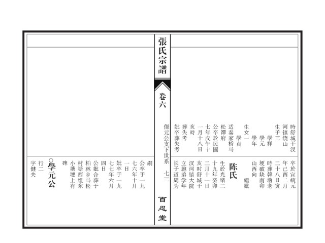 张氏宗谱 卷六 傑元公支下世系 妣卒葬失考 葬失考 亥時 一月十八日 七年戊午十 公卒於民國 松谭府 适秦家桥马 生女一 生子三 河镇绕山 時舒城干汊 學貞 學年 學元 學祥 字健夫 行二 學元公 碑 小塘埂上有 村塘西组东 柏林乡马松 公妣合葬于 四日 七七年六月 妣卒于一九 一日 七六年十月 公卒于一九 嗣 长子道周为 立胞弟学年 汊河镇大院 亥时舒城干 二月十一日 十九年癸卯 生於光绪二 陈氏 山酉向 埂破缺南卯 時葬韓塘老 二十八日寅 年己酉二月 卒於宣統元 七三 繼妣 百忍堂