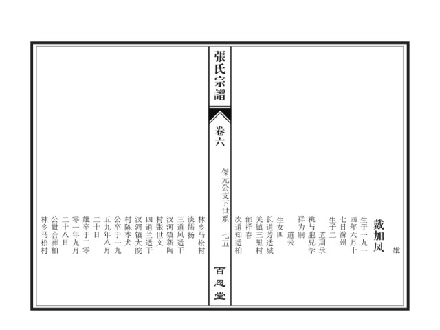 张氏宗谱 卷六 傑元公支下世系 林乡马松村 公妣合葬柏 二十八日 零一年九月 妣卒于二零 二十日 五九年八月 公卒于一九 村陈本犬 汊河镇大院 四道兰适干 村张世文 汊河镇新陶 三道凤适干 谈儒扬 林乡马松村 次道知适柏 邰祥春 关镇三里村 长道芳适城 生女四 祥为嗣 祧与胞兄学 生子二 七日滁州 四年六月十 生于一九一 戴加凤 道云 道 七五 周 承 妣 百忍堂