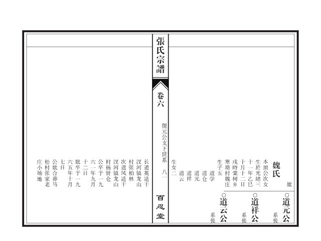 张氏宗谱 卷六 傑元公支下世系 庄小场地 松村张家老 公妣合葬马 七日 六五年十月 妣卒于一九 十二日 六一年九月 公卒于一九 村杨贤仓 汊河镇龙山 次道凤适干 村张柏林 汊河镇龙山 长道英适干 生女二 生子五 寒塘村魏庄 戌時棠树乡 十月十二日 十一年乙巳 生於光緒三 本坦公次女 魏氏 八一 道元 道仓 道学 道云 道祥 妣 百忍堂 道云公 道祥公 道元公 系後 系後 系後