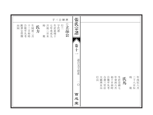 张氏宗谱 子三公輝厯 向同 附葬父塋側 公妣卒失考 十二日卯時 生同庚二月 氏方 時 月初二日未 七年戊戌九 生於嘉靖十 字代恩 行三 立品公 妣 卷十一 達公支下世系 巳向 大路西亥山 合葬三里店 公妣卒失考 初十日酉時 年癸酉六月 生於崇禎七 氏馬 時 二十八日辰 年戊辰八月 一〇 妣 百忍堂