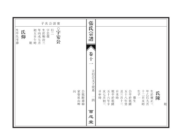张氏宗谱 子次公澍寰 生卒失考葬 氏仰 初五日午時 年丙戌七月 生於順治三 字忠傑 行二 宇安公 妣 卷十一 立行公支下世系 向 家 公妣附葬韓 日申時 亥七月初三 五十六年辛 妣卒於乾隆 日未時 丑三月十三 五十八年癸 公卒於乾隆 生子一 十二日亥時 年乙巳九月 生於雍正三 氏陳 傑生 艮 一四 山 坤 妣 百忍堂