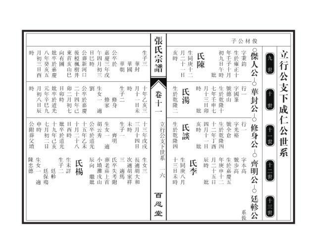 時 月初三日酉 八年癸亥五 妣卒於嘉慶 向有圖 東首亥山巳 後椏楓樹井 公葬新河口 日巳時 午四月初三 嘉慶三年戊 公卒於 生子三 亥時 月二十一日 生同庚十二 氏陳 初九日午時 年壬子十月 生於雍正十 字秉鈞 傑人公 立行公支下成仁公世系