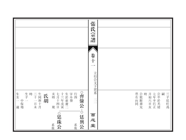 张氏宗谱 卷十一 立行公支下世系 生女一 生子一 時 二十一日未 生同庚十月 氏胡 亥時 七月十四日 十三年戊寅 生於嘉慶二 字本發 行四 齊儉公 塋右向同 公妣附葬兄 時 月初六日亥 七年辛巳正 公卒於光緒 嗣 三子廷柱爲 中保殤 二一 妣 適 百忍堂 廷珠公 廷興公 系後 系後