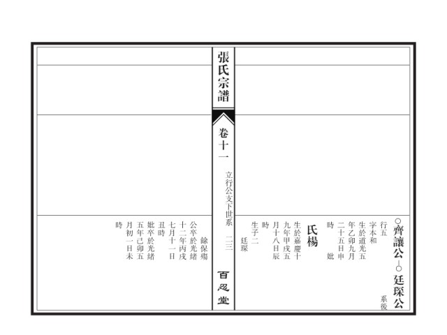 张氏宗谱 卷十一 立行公支下世系 時 月初一日未 五年己卯五 妣卒於光緒 丑時 七月十一日 十二年丙戌 公卒於光緒 生子二 時 月十八日辰 九年甲戌五 生於嘉慶十 氏楊 時 二十五日申 年乙卯九月 生於道光五 字本和 行五 齊讓公 餘保殤 二三 廷琛 妣 百忍堂 廷琛公 系後