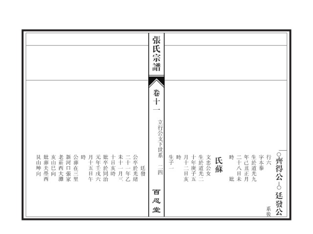 张氏宗谱 卷十一 立行公支下世系 艮山坤向 妣葬夫塋西 亥山巳向 老莊西大灘 新河口張家 公葬在三里 時 月十五日午 元年壬戌六 妣卒於同治 十日亥時 未十一月三 二十一年乙 公卒於光緒 生子一 時 月十二日亥 十年庚子五 生於道光二 文忠公女 氏蘇 時 二十八日未 年己丑正月 生於道光九 字本泰 行六 齊得公 廷發 二四 妣 百忍堂 廷發公 系後