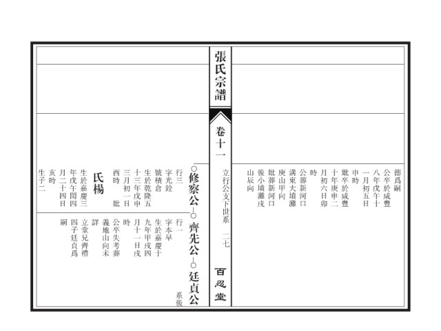 张氏宗谱 卷十一 生子二 亥時 月二十四日 年戊午閏四 生於嘉慶三 氏楊 酉時 三月初一日 十三年戊申 生於乾隆五 號積倉 字光銓 行三 修察公 立行公支下世系 山辰向 後小墳灘戌 妣葬新河口 庚山甲向 溝東大墳灘 公葬新河口 時 月初六日卯 十年庚申二 妣卒於咸豐 申時 一月初五日 八年戊午十 公卒於咸豐 德爲嗣 妣 嗣 四子廷貞爲 立堂兄齊禮 詳 義地山向未 公卒失考葬 時 月十一日戌 九年甲戌四 生於嘉慶十 字本早 行一 齊先公 二七 百忍堂 廷貞公 系後
