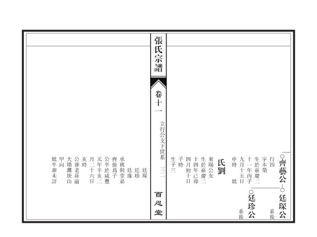 张氏宗谱 卷十一 立行公支下世系 妣卒葬未詳 甲向 大墳灘庚山 公葬老莊前 亥時 月二十六日 元年辛亥二 公卒於咸豐 齊儉爲子 承祧與堂弟 生子三 子時 四月初十日 十四年己卯 生於嘉慶二 東陽公女 氏劉 申時 九月十五日 十一年丙子 生於嘉慶二 字本榮 行四 齊藝公 廷琛 廷珠 三二 廷珍 妣 百忍堂 廷珍公 廷琛公 系後 系後