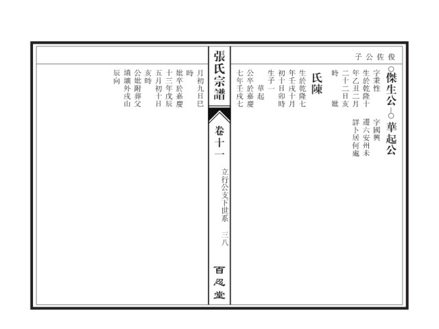 张氏宗谱 子公佐俊 辰向 墳壙外戌山 公妣附葬父 亥時 五月初十日 十三年戊辰 妣卒於嘉慶 時 月初九日巳 七年壬戌七 公卒於嘉慶 生子一 初十日卯時 年壬戌十月 生於乾隆七 氏陳 時 二十二日亥 年乙丑二月 生於乾隆十 字秉性 傑生公 華起 妣 詳卜居何處 遷六安州未 字國興 華起公 卷十一 立行公支下世系 三八 百忍堂