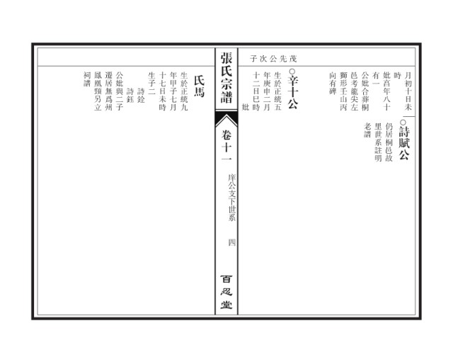 张氏宗谱 子次公先茂 祠譜 鳳凰頸另立 遷居無爲州 公妣與二子 生子二 十七日未時 年甲子七月 生於正統九 氏馬 十二日巳時 年庚申二月 生於正統五 辛十公 向有碑 獅形壬山丙 邑考龍尖左 公妣合葬桐 有一 妣亯年八十 時 月初十日未 詩銓 詩鈺 妣 老譜 里世系註明 仍居桐邑故 詩賦公 卷十一 庠公支下世系 四 百忍堂