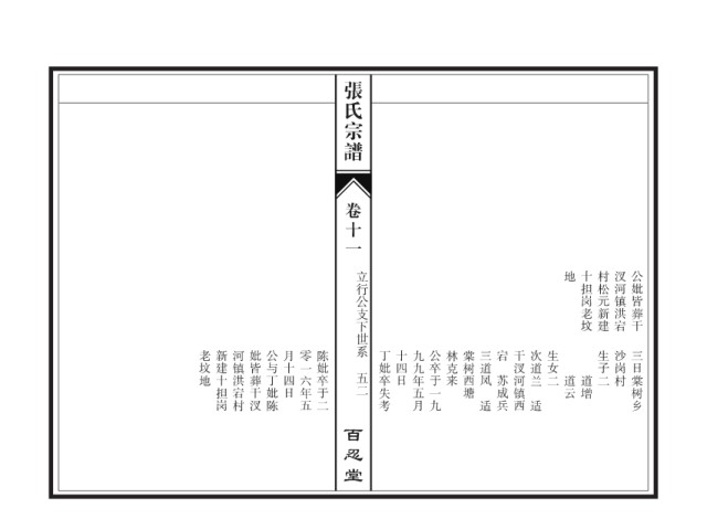 张氏宗谱 卷十一 立行公支下世系 地 十担岗老坟 村松元新建 汊河镇洪宕 公妣皆葬干 老坟地 新建十担岗 河镇洪宕村 妣皆葬干汊 公与丁妣陈 月十四日 零一六年五 陈妣卒于二 丁妣卒失考 十四日 九九年五月 公卒于一九 林克来 棠树西塘 三道凤 宕 干汊河镇西 次道兰 生女二 生子二 沙岗村 三日棠树乡 五二 苏成兵 道云 道增 适 适 百忍堂