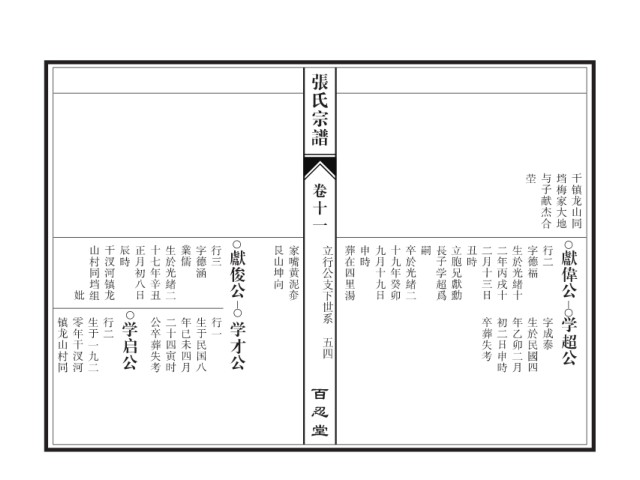 山村同垱组 干汊河镇龙 辰時 正月初八日 十七年辛丑 生於光緒二 業儒 字德涵 行三 獻俊公 艮山坤向 家嘴黄泥 立行公支下世系 葬在四里湯 申時 九月十九日 十九年癸卯 卒於光緒二 嗣 長子学超爲 立胞兄獻勳 丑時 二月十三日 二年丙戌十 生於光緒十 字德福 行二 獻偉公
