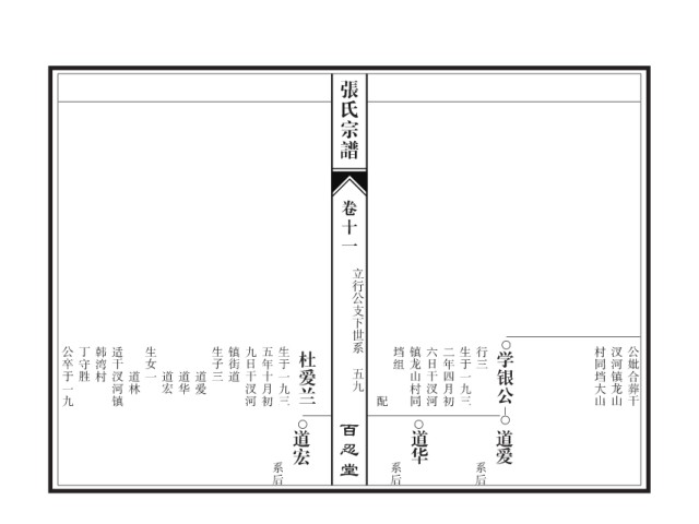 张氏宗谱 卷十一 立行公支下世系 公卒于一九 丁守胜 韩湾村 适干汊河镇 生女一 生子三 镇街道 九日干汊河 五年十月初 生于一九三 杜爱兰 垱组 镇龙山村同 六日干汊河 二年四月初 生于一九三 行三 学银公 村同垱大山 汊河镇龙山 公妣合葬干 道爱 道宏 道林 五九 道华 配 百忍堂 道宏 道华 道爱 系后 系后 系后