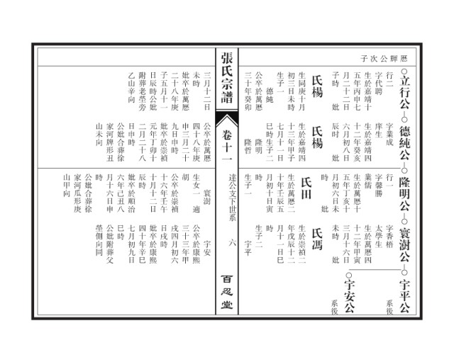 山甲向 家河瓜形庚 公妣合葬徐 時 月十六日申 六年己丑八 妣卒於順治 辰時 十月十二日 十六年壬午 公卒於崇禎 胡 生女一 達公支下世系 生子一 時 月初十日寅 十年壬辰五 生於萬厯二 氏田 時 月初六日未 五年丁亥十 生於萬厯十 業儒 字馨勝 行一 隆明公