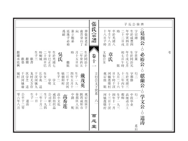 城村 干汊河镇瑜 次学芝 龙村尤方存 干汊河镇九 长学英 生女二 生子二 镇朝阳村 三日干汊河 四年五月十 生于一九一 戴茂英 立行公支下世系 观宕组 河镇莲墩村 日午時干汊 九月二十六 十二年丙午 生於光緒三 字德修 行二 獻蘭公