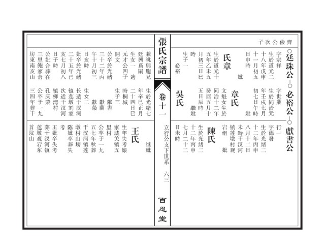 坊東南亥山 三里鲍家倉 公妣合葬在 日子時 亥七月初八 二十五年己 妣卒於光緒 日亥時 午十月初三 三十二年丙 公卒於光緒 開文 元才公四子 生女一 廷興爲嗣 兼祧與胞兄 生子一 時 月初三日巳 五年乙未五 生於道光十 氏章 日申時 十一月初五 十八年戊申 生於道光二 字宗祥 廷珠公