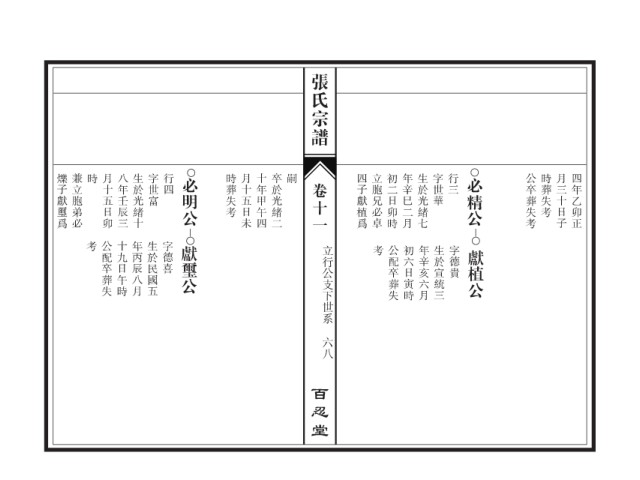 张氏宗谱 爍子獻璽爲 兼立胞弟必 時 月十五日卯 八年壬辰三 生於光緒十 字世富 行四 必明公 時葬失考 月十五日未 十年甲午四 卒於光緒二 嗣 四子獻植爲 立胞兄必卓 初二日卯時 年辛巳二月 生於光緒七 字世華 行三 必精公 公卒葬失考 時葬失考 月三十日子 四年乙卯正 卷十一 考 公配卒葬失 十九日午時 年丙辰八月 生於民國五 字德喜 獻璽公 立行公支下世系 考 公配卒葬失 初六日寅時 年辛亥六月 生於宣統三 字德貴 獻植公 六八 百忍堂