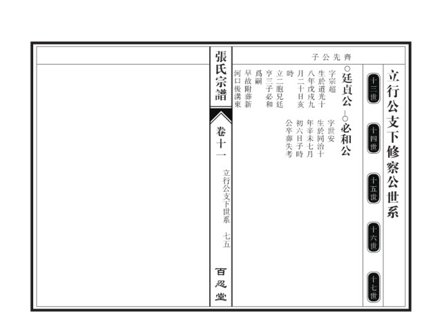 张氏宗谱 子公先齊 河口後溝東 早故附葬新 爲嗣 亨三子必和 立二胞兄廷 時 月二十日亥 八年戊戌九 生於道光十 字宗超 廷貞公 立行公支下修察公世系 十三世 公卒葬失考 初六日子時 年辛未七月 生於同治十 字世安 必和公 卷十一 十四世 立行公支下世系 十五世 十六世 七五 百忍堂 十七世
