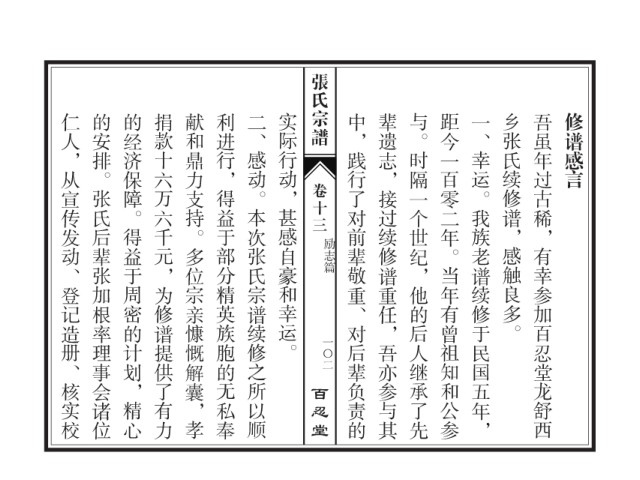 仁人,从宣传发动、登记造册、核实校 的安排。张氏后辈张加根率理事会诸位 的经济保障。得益于周密的计划,精心 捐款十六万六千元,为修谱提供了有力 献和鼎力支持。多位宗亲慷慨解囊,孝 利进行,得益于部分精英族胞的无私奉 二、感动。本次张氏宗谱续修之所以顺 实际行动,甚感自豪和幸运。 中,践行了对前辈敬重、对后辈负责的 辈遗志,接过续修谱重任,吾亦参与其 与。时隔一个世纪,他的后人继承了先 距今一百零二年。当年有曾祖知和公参 一、幸运。我族老谱续修于民国五年, 乡张氏续修谱,感触良多。 吾虽年过古稀,有幸参加百忍堂龙舒西 修谱感言