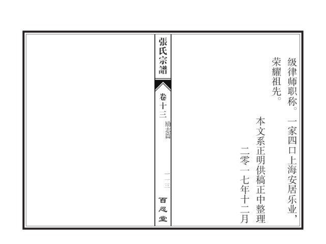 张氏宗谱 荣耀祖先。 级律师职称。一家四口上海安居乐业, 卷十三 本文系正明供稿正中整理 励志篇 二零一七年十二月 一一三 百忍堂
