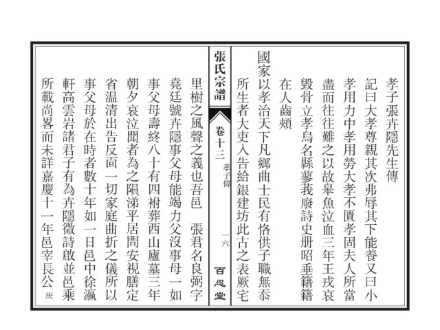 所載尚畧而未詳嘉慶十一年邑宰長公 軒高雲岩諸君子有為卉隱徵詩啟並邑乘 事父母於在時者數十年如一日邑中徐瀛 省温清出告反靣一切家庭曲折之儀所以 朝夕哀泣聞者為之隕涕平居問安視膳定 事父母壽終八十有四袝葬西山廬墓三年 堯廷號卉隱事父母能竭力父沒事母一如 里樹之風聲之義也吾邑 所生者大吏入告給銀建坊此古之表厥宅 以孝治天下凡鄉曲士民有恪供子職無忝 在人齒頰 毀骨立孝烏名縣蓼莪廢詩史册昭垂籍籍 盡而往往難之以故皋魚泣血三年王戎哀 孝用力中孝用勞大孝不匱孝固夫人所當 記曰大孝尊親其次弗辱其下能養又曰小 孝子張卉隱先生傳